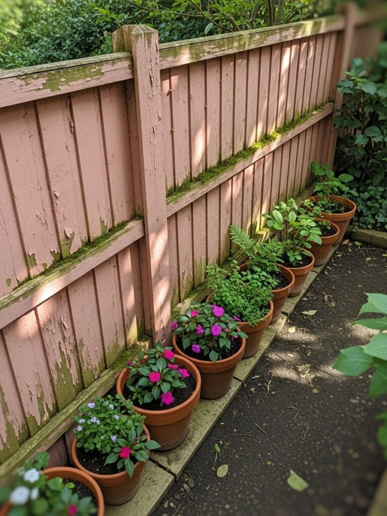 This soft pink fence has a slightly distressed finish that gives it a cozy and romantic feel. Terracotta pots line the base, filled with small flowering plants and greenery. The narrow path beside it makes the space feel intimate and thoughtfully arranged. It feels sweet, simple, and very charming.