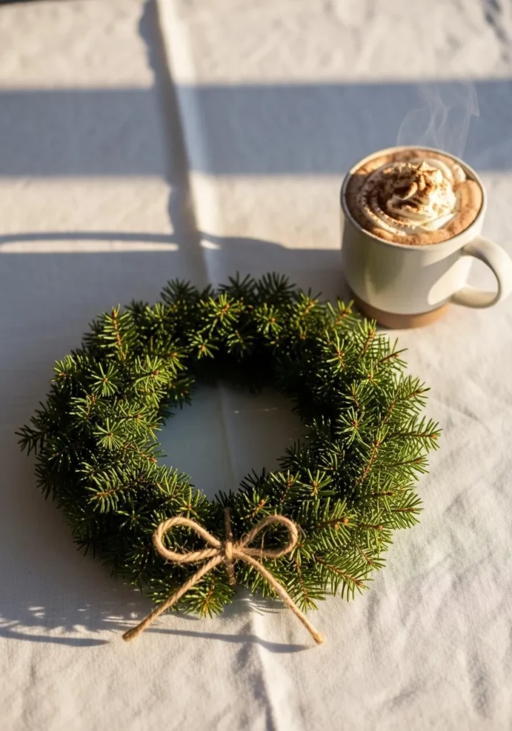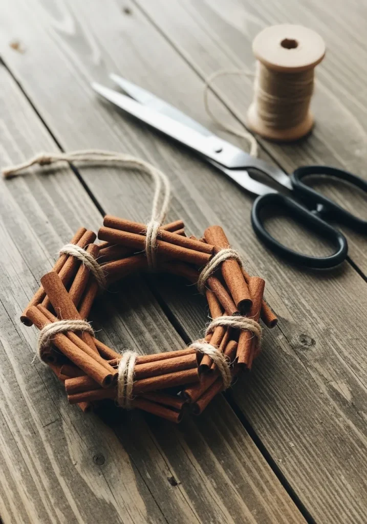 This adorable mini wreath is made entirely from cinnamon sticks tied together with natural jute twine. The rustic texture of the wood pairs perfectly with the simplicity of the string, creating something that feels straight out of a Scandinavian Christmas kitchen. It looks amazing hanging on cabinet doors or tied to gift boxes for a homemade touch.