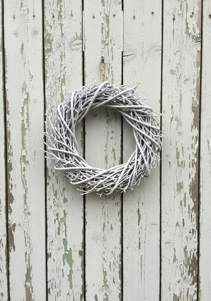 This little wreath has a frosty charm with its white-painted twigs intertwined into a delicate circular shape. The design feels crisp and modern while still keeping a cozy winter feel. It’s perfect for hanging on a door, wall, or even in a window where the light can highlight its snowy look.