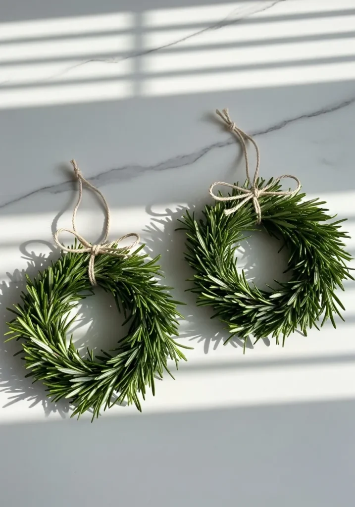 These dainty little wreaths are made from fragrant rosemary sprigs tied with natural string bows. The greenery looks lush and fresh, and the small size makes them perfect for place settings, gift toppers, or even cabinet decorations. They give off that “simple elegance” look that’s both charming and practical.