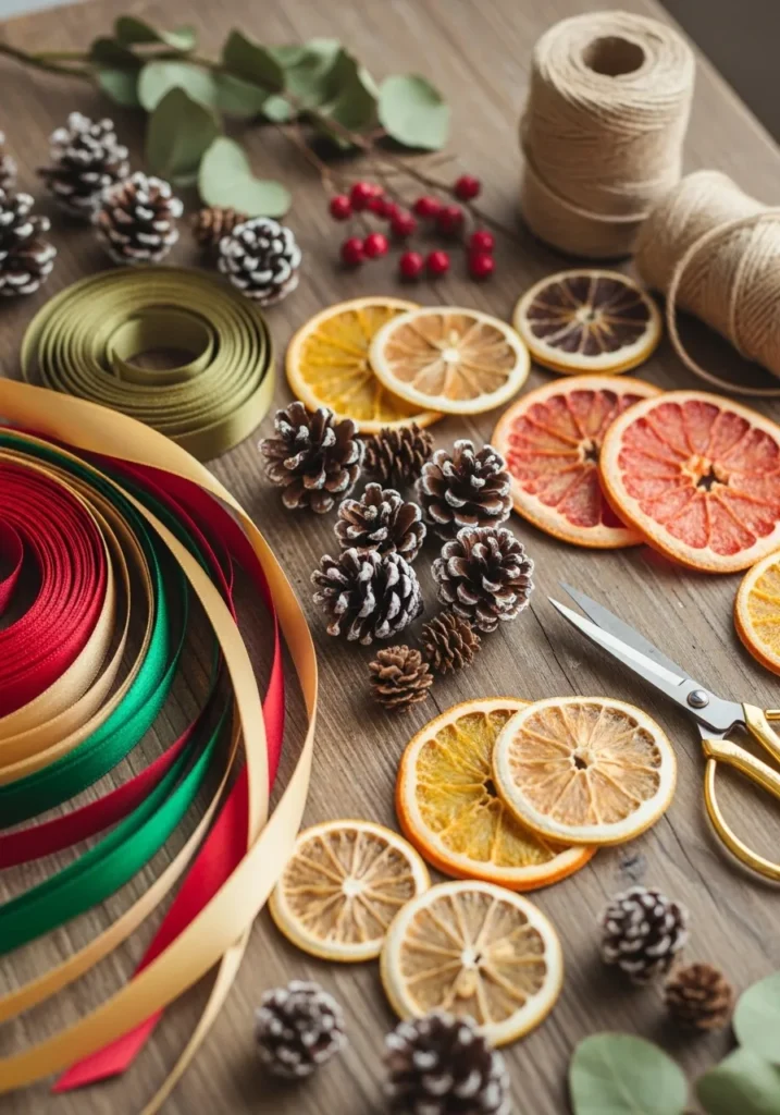 This cozy flat lay captures everything you need to create your own wreaths—pinecones, ribbons, dried citrus slices, and twine all ready for crafting magic. It’s a reminder that half the fun of decorating is in the making. Every piece adds its own personality to your finished design.