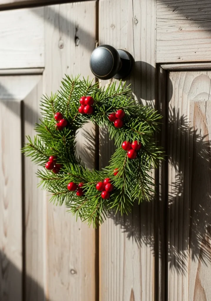 This wreath combines classic pine needles with clusters of bright red berries for that quintessential Christmas look. The contrast between the deep green and red gives it a timeless charm that instantly brightens any space. It’s the kind of decor that looks lovely on a kitchen cabinet or wardrobe door.