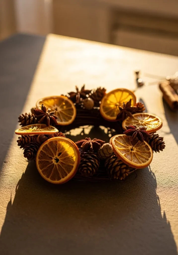 This stunning mini wreath is bursting with texture and warmth, featuring dried orange slices, pinecones, and star anise. The golden tones from the oranges glow beautifully when sunlight hits them, giving the whole piece a cozy amber hue. It’s the kind of handmade decor that smells like Christmas magic.