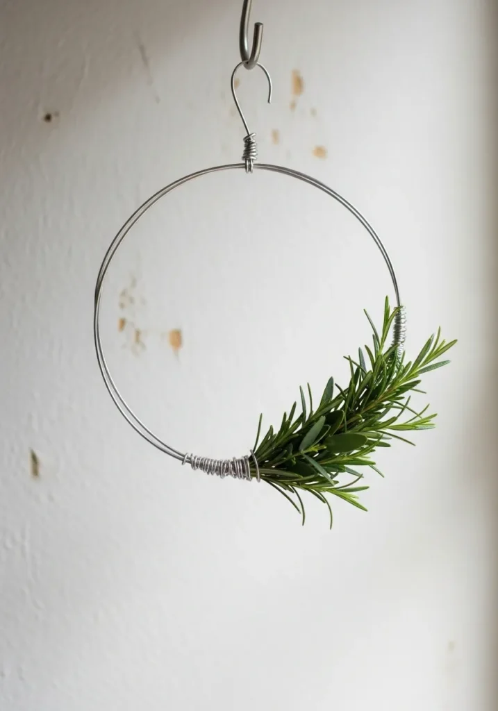 This wreath takes minimalism to heart, featuring a simple silver wire loop wrapped with a small cluster of fresh rosemary sprigs. The clean metal frame gives it a modern edge, while the herbs add a natural and fragrant touch. It’s the kind of understated beauty that works perfectly in a Scandinavian-inspired home or a kitchen window.