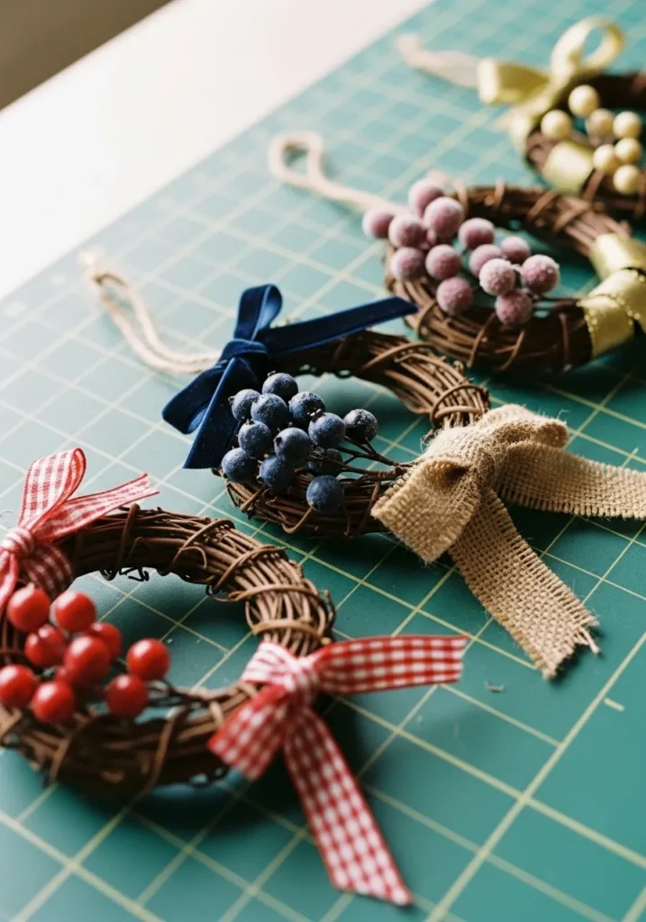 These charming mini wreaths are made from small grapevine rings decorated with clusters of frosted berries and finished with ribbons in different colors like red, blue, and gold. Each one has its own personality, yet they all feel perfectly festive together. They look adorable on gift packages or strung along a window for a touch of color.