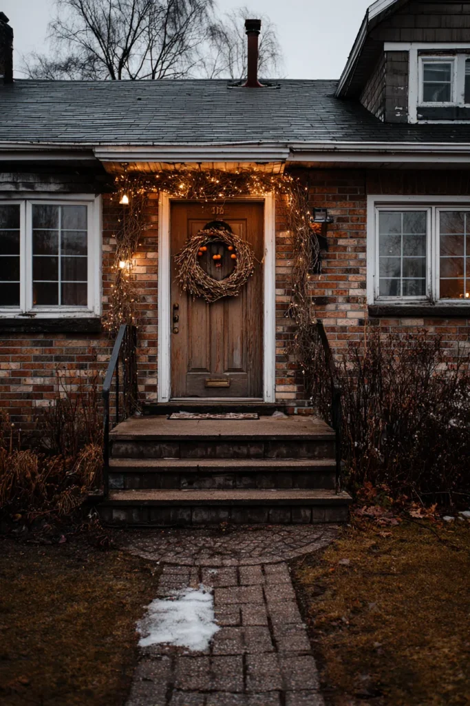 This charming brick home proves that you don’t need a ton of decorations to make a big impact. A simple twig wreath with dried oranges brings a touch of natural beauty to the front door, while warm fairy lights wrap around the doorway to add a cozy, golden glow. The soft lighting reflects off the rustic wood, creating that perfect “welcome home” feeling you want during the holidays. Everything feels understated but full of heart.