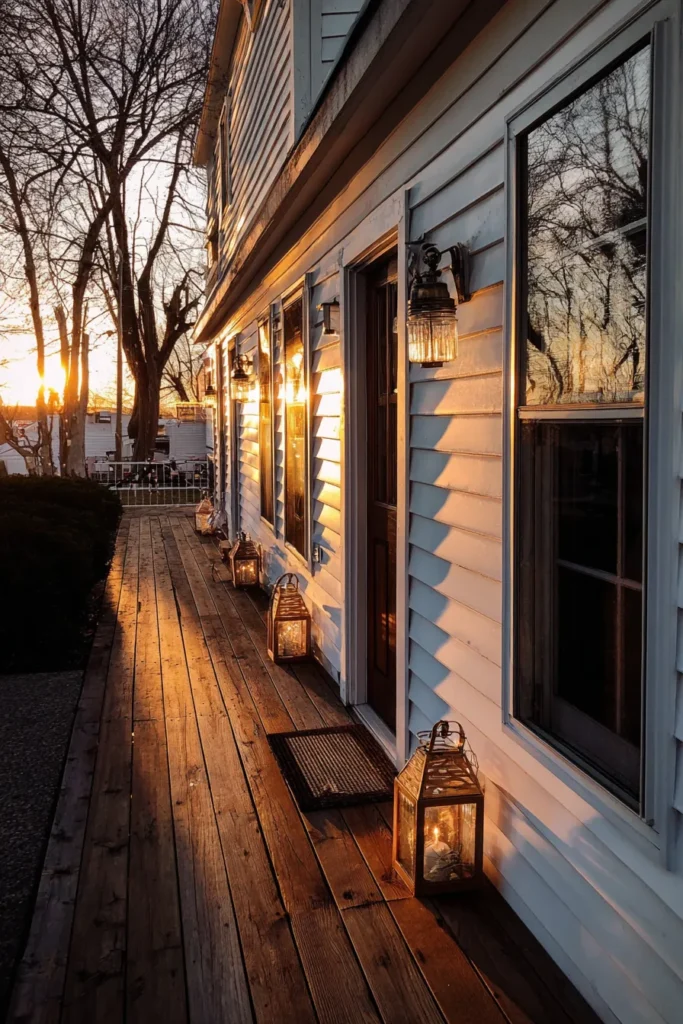 This charming setup features a row of lanterns softly lighting up a wooden porch, catching the last golden rays of sunset against a cozy white-paneled house. The warm glow from the candles reflects beautifully on the glass, while the natural wood tones of the deck add an inviting, earthy touch. The look feels effortless yet thoughtfully put together, balancing rustic simplicity with a hint of elegance that feels right at home for the holidays.