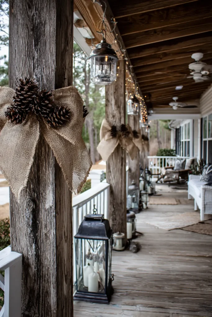 Burlap Bows and Pinecones on a Cozy Country Porch