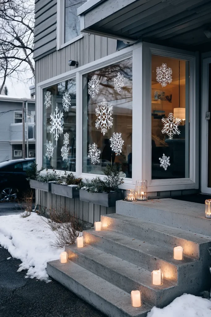 This modern setup proves that a little creativity can turn a simple exterior into a winter wonderland. Large white snowflake decals cover the big front windows, giving the home a frosty, festive feel without any real snow needed. Below, soft candlelight lines the concrete steps, glowing against the cold gray tones and fresh snow. A few minimal planters filled with winter greenery add a touch of life, making the entire scene feel polished but still cozy and approachable.