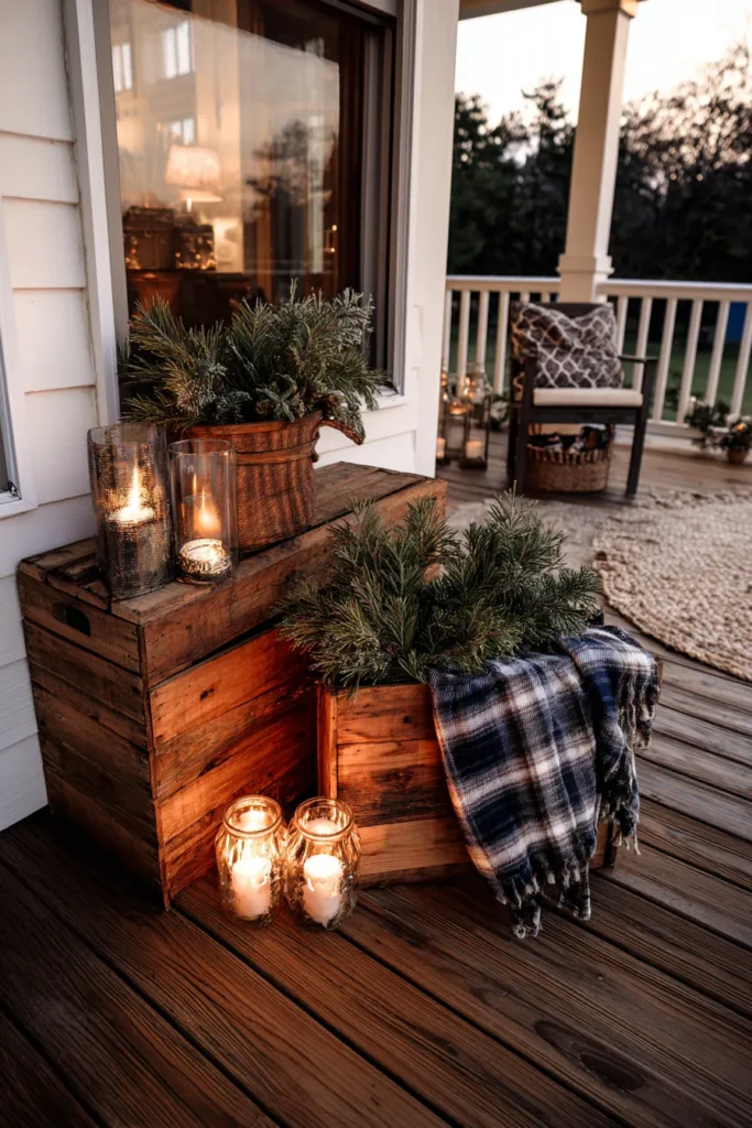 This cozy porch corner captures that effortless Christmas charm that feels both rustic and inviting. Stacked wooden crates are repurposed into festive displays, each holding bundles of pine greenery and glowing candles in mason jars. A soft plaid blanket draped over one of the boxes adds just the right touch of warmth, tying together the natural wood tones and soft candlelight. The whole setup feels handmade yet polished, like something you’d spot in a country home magazine but could easily recreate yourself.