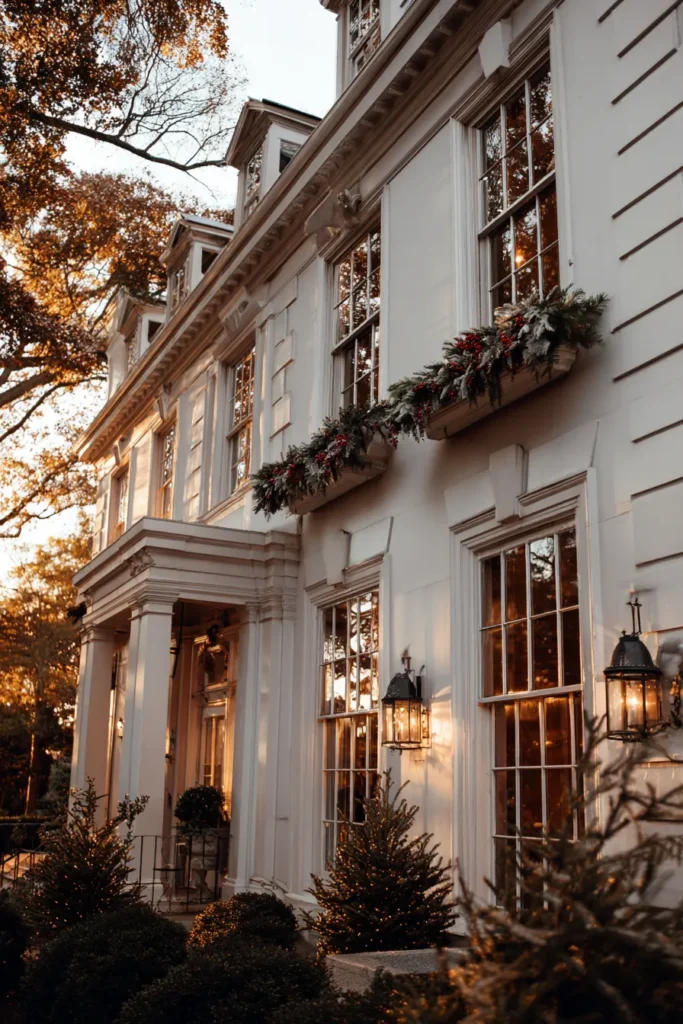 This stately home looks straight out of a timeless Christmas movie. The tall white exterior is perfectly complemented by window boxes overflowing with lush greenery, frosted accents, and pops of red berries. Soft golden light pours through the large windows, reflecting off the crisp white trim and the charming lantern sconces. Small evergreens twinkling with fairy lights frame the entryway, adding just the right amount of sparkle to balance the traditional elegance.