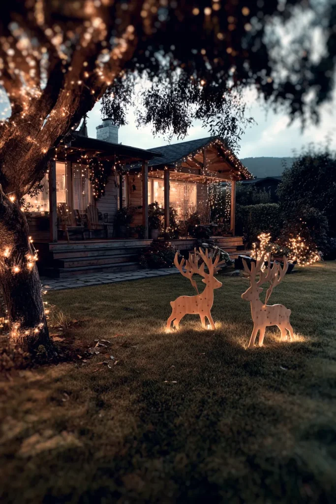 This charming yard scene feels straight out of a cozy holiday story. The wooden reindeer figures softly glow from below, casting a magical light across the grass. Fairy lights wrap around the tree trunks and frame the porch, giving the entire space a warm, inviting sparkle. The glow from the house adds even more coziness, making the whole scene feel like the perfect mix of rustic simplicity and Christmas cheer.