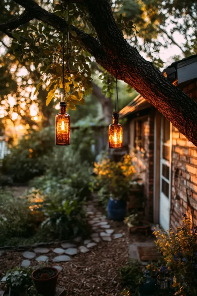 This charming outdoor setup turns ordinary glass bottles into glowing little works of art. Two amber bottles hang from a sturdy tree branch, each holding a warm light that casts a soft, golden hue across the garden. The rustic brick wall and winding stone path in the background make the whole space feel cozy and lived-in, like a hidden nook made for quiet winter evenings. It’s simple, enchanting, and full of personality.