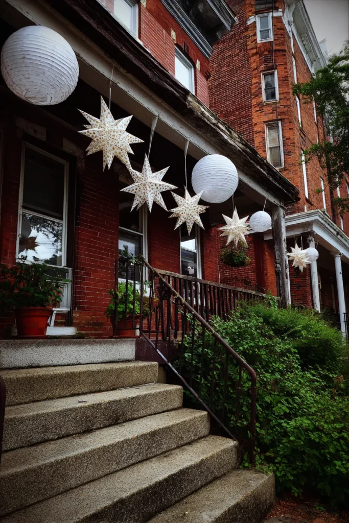 This fun and creative setup brings instant holiday cheer with paper stars and lanterns hung across the porch. The crisp white decorations pop beautifully against the rustic red brick exterior, creating a look that feels festive yet effortlessly relaxed. The mix of shapes and sizes adds playful variety, while the soft glow from the lanterns gives the space a cozy, inviting feel that’s perfect for evening gatherings or quiet nights in.