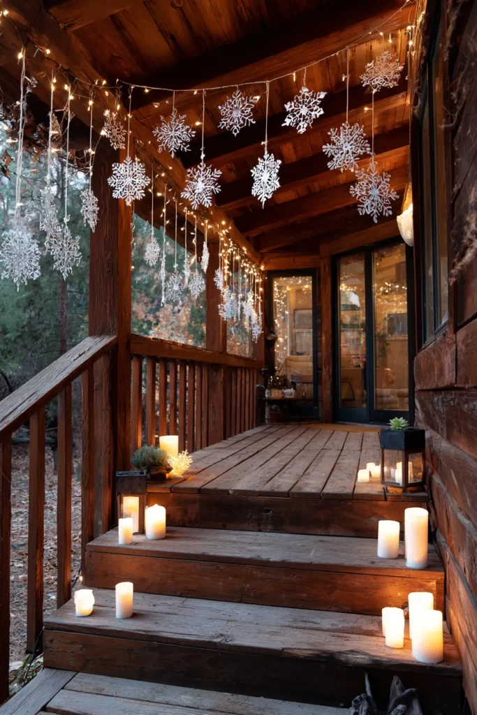 I think this look is absolutely enchanting. It feels like the kind of place you’d want to curl up with a cup of hot chocolate and watch the snow fall. The candles and snowflakes add such a delicate, romantic touch, and the best part is how easy it is to recreate. A few lights, some paper snowflakes, and a handful of candles can make even the simplest porch feel like a holiday retreat.