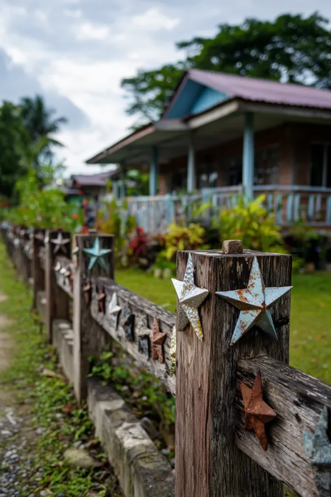 This charming setup takes a simple wooden fence and turns it into a festive country-style display. Weathered metal stars in different colors and finishes are attached along the posts, giving off a cozy, handmade feel. The mix of rustic textures against the natural wood adds so much character, while the uneven patina on the stars creates that perfect vintage look. It’s understated but full of charm, making the whole property feel warm and welcoming.
