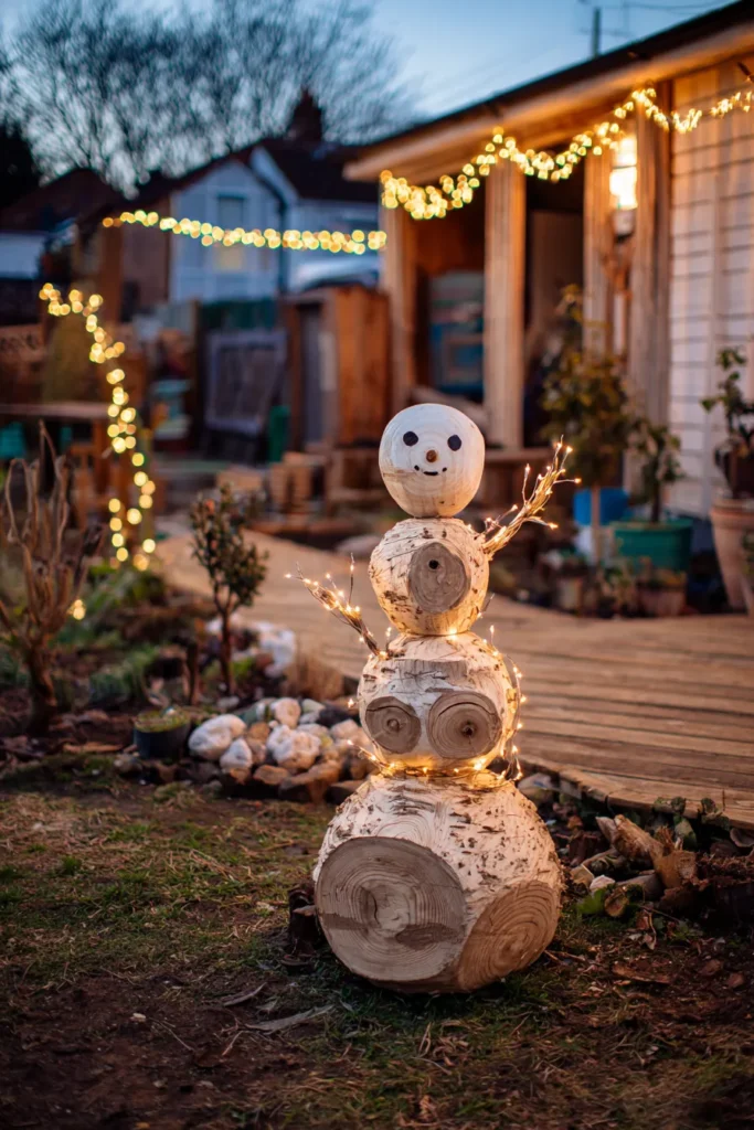 This adorable yard setup puts a creative twist on a holiday classic. Instead of snow, this snowman is made entirely of stacked wooden logs, complete with a hand-carved smile and branch arms. A string of warm fairy lights wraps around its body, giving it a soft, golden glow that looks magical as evening sets in. The scene feels playful and handmade, with the cozy backdrop of a string-lit porch adding just the right touch of Christmas warmth.