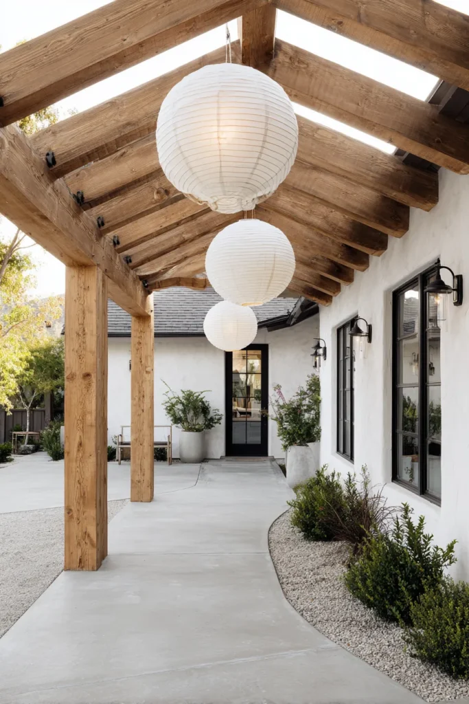 This elegant outdoor setup shows just how stunning simplicity can be. Large white paper lanterns hang gracefully under a wooden pergola, softly illuminating the entryway with a warm, gentle glow. The natural tones of the wood beams pair beautifully with the clean white walls, creating a cozy yet modern space that feels festive without being overdone. The look is airy, calm, and perfect for anyone who loves understated holiday charm.