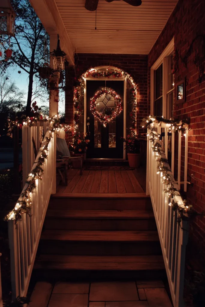 This inviting porch setup brings timeless Christmas charm to life with warm white lights, lush garlands, and a glowing wreath framing the front door. The soft lighting wraps around the railings and doorframe, creating that perfect golden shimmer against the red brick. A cozy wooden floor and a few potted plants complete the scene, making it feel like the kind of porch you’d want to stop by with a mug of cocoa in hand.