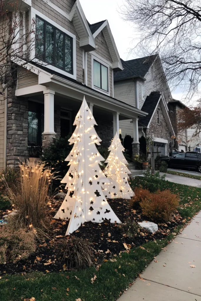 This front yard setup shows how a few handmade pieces can completely transform your outdoor space for the holidays. Two wooden Christmas trees, painted crisp white and cut in a modern silhouette, stand proudly near the porch. They’re wrapped in warm string lights that sparkle beautifully at dusk, bringing a cozy glow to the neutral tones of the home’s stone and siding. The design feels festive but still clean and minimal, blending perfectly with the surrounding winter landscape.