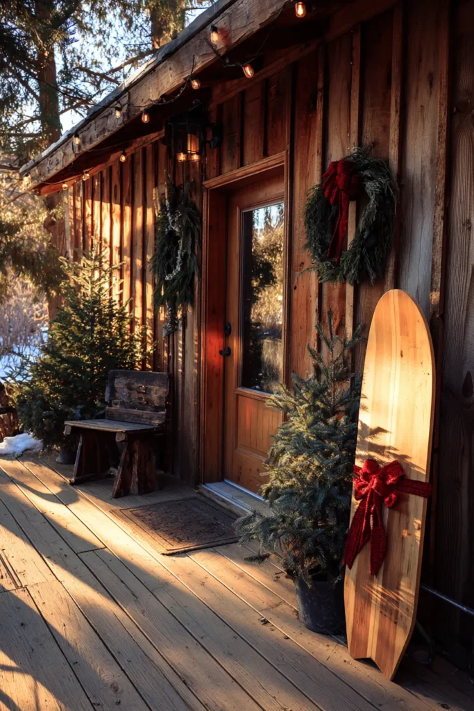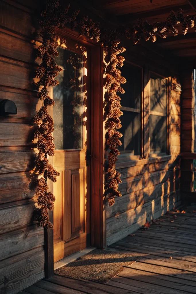 This rustic porch design feels like a warm hug on a chilly winter day. A simple garland made entirely of pinecones frames the wooden door, catching the soft glow of the afternoon sun. The natural textures of the pinecones blend beautifully with the weathered wood siding, creating an earthy, cabin-inspired look that feels cozy and timeless. It’s an understated take on Christmas decor that celebrates the beauty of nature itself.