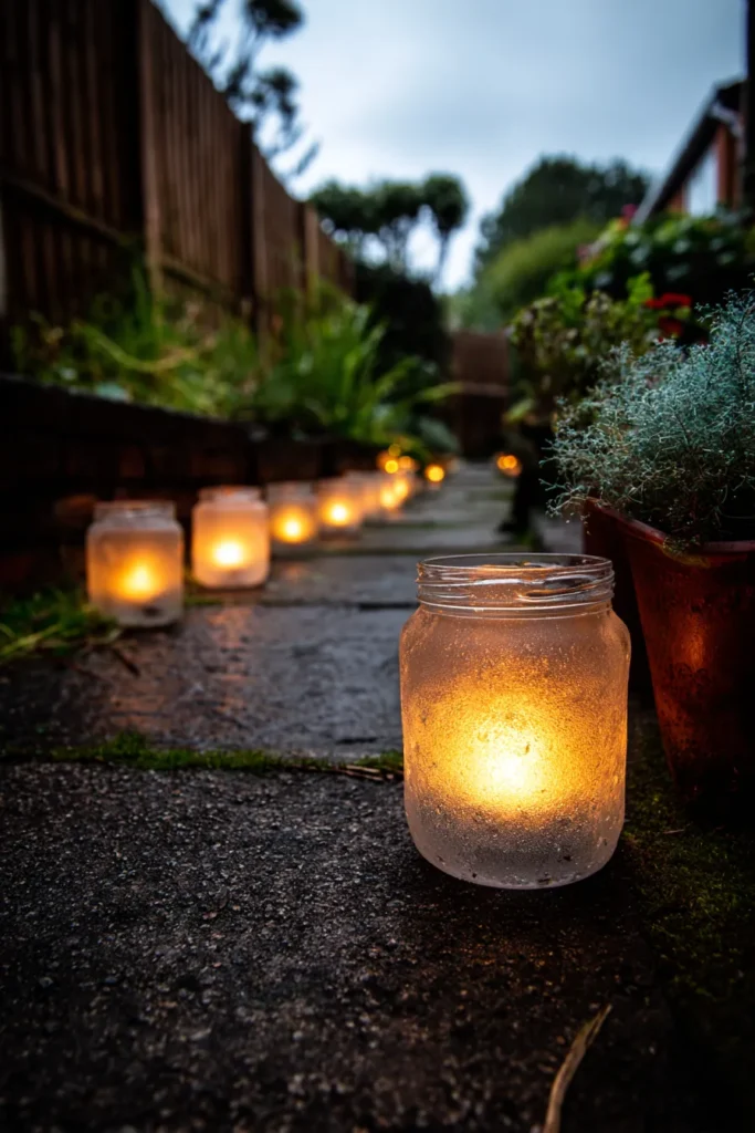 This simple yet stunning walkway design features frosted mason jars glowing softly with candlelight, lining a garden path that feels straight out of a Christmas movie. The jars shimmer gently in the cool evening air, creating a warm, welcoming glow that guides guests right to the door. It’s the perfect mix of rustic charm and holiday coziness, and it turns even the plainest path into something magical.