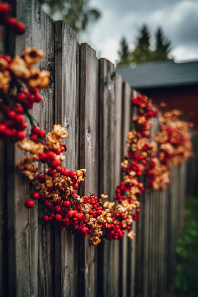 This charming outdoor detail brings a touch of handmade magic to the yard. A rustic wooden fence is dressed with a garland made of red berries and golden popcorn, creating the sweetest mix of color and texture. The natural tones of the fence make the bright red berries pop beautifully, giving the whole setup that cozy, nostalgic Christmas vibe. It’s simple, cheerful, and feels straight out of an old-fashioned holiday postcard.