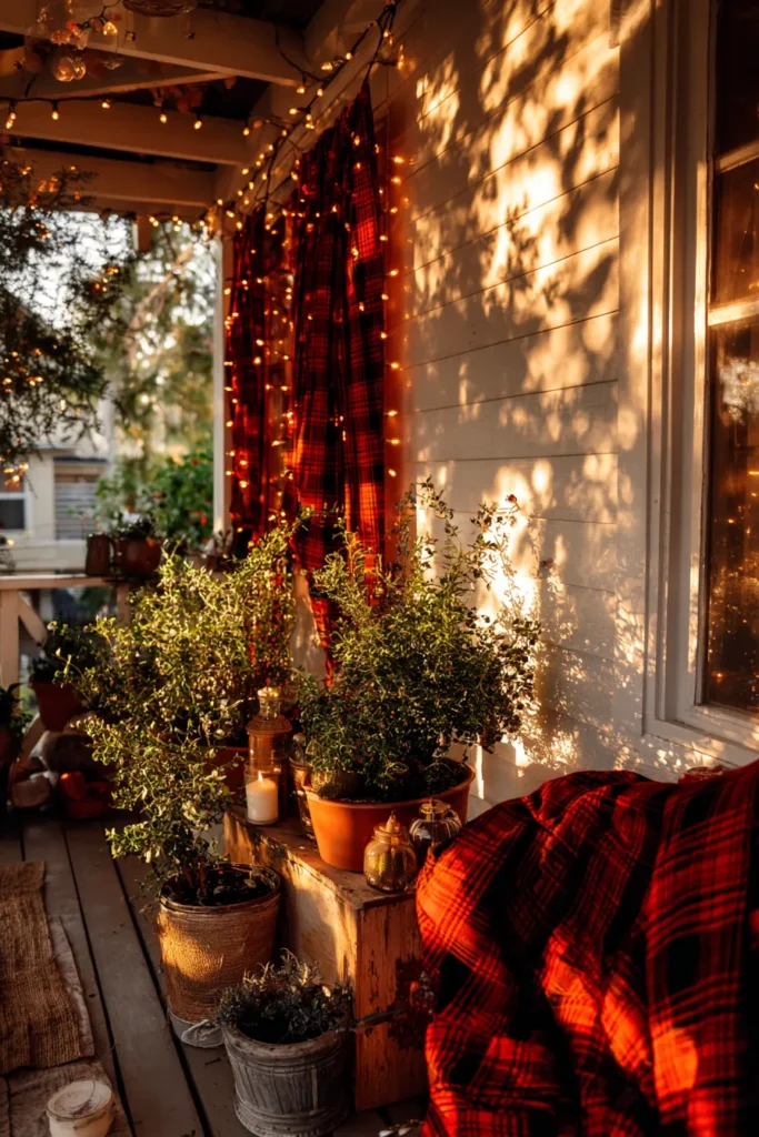 This porch design feels like Christmas warmth wrapped in a flannel blanket. Strings of fairy lights softly glow against the wall, casting golden reflections on the red plaid fabric hanging behind potted greenery. The mix of rustic textures—wood, fabric, and clay pots—creates a space that feels inviting and lived-in. It’s the kind of porch that makes you want to grab a blanket, light a candle, and just soak in the cozy glow of the season.