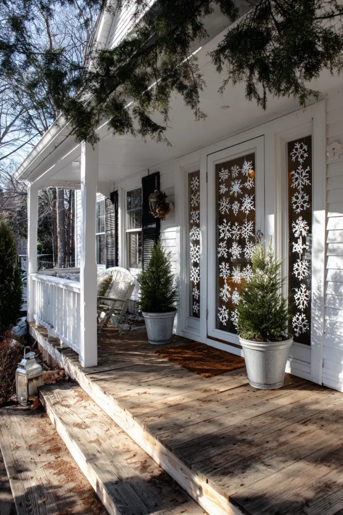 This porch feels like a peaceful winter morning brought to life. The crisp white siding, natural wood floorboards, and glass doors covered in delicate snowflake decals create a simple yet charming holiday look. Two small potted evergreens in galvanized buckets add a cozy touch of greenery, keeping the space balanced between festive and fresh. It’s the kind of design that makes you smile before you even step inside.
