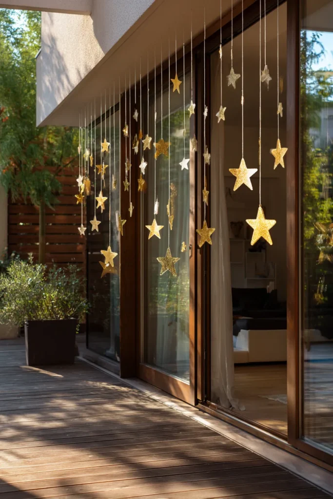 This sleek modern porch features a magical curtain of golden and white stars gently swaying in the sunlight. Hung from thin strings, the stars sparkle beautifully against the glass doors, creating a soft shimmer that feels both festive and sophisticated. The clean lines of the wooden deck and minimalist planters let the glittering stars take center stage, proving that Christmas charm doesn’t need to be loud to make an impression.