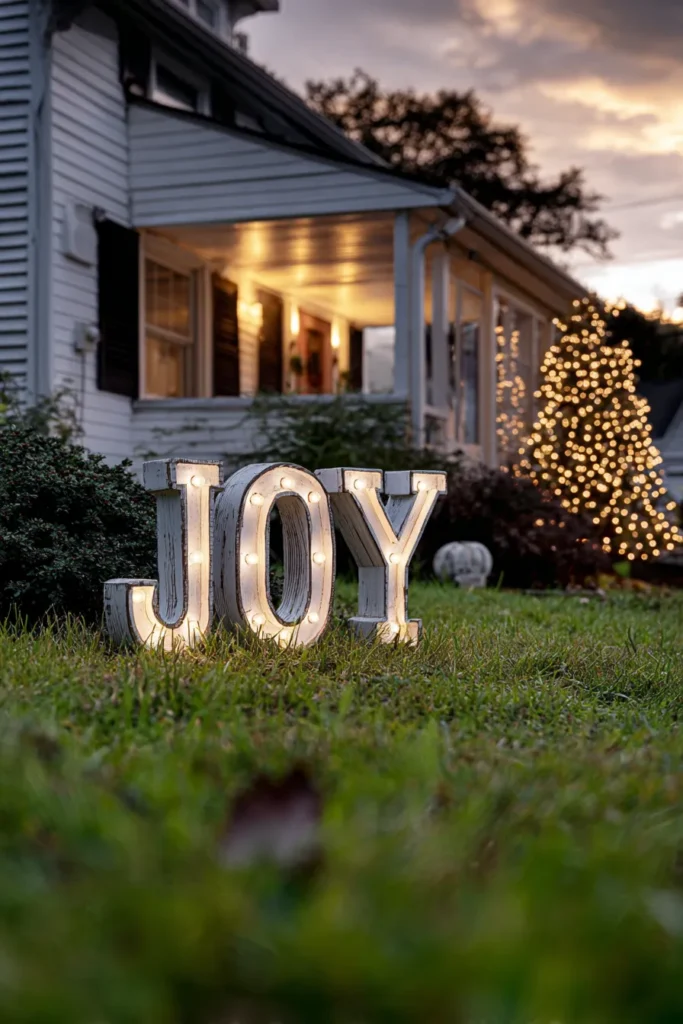 This cheerful setup captures that classic holiday spirit in the sweetest way. Large wooden letters spelling out “JOY” sit proudly on the lawn, softly glowing from within as evening sets in. The surrounding house, with its warm porch lighting and sparkling tree in the background, feels straight out of a cozy Christmas movie. It’s a simple idea that instantly transforms the yard into a happy, welcoming scene for anyone passing by.