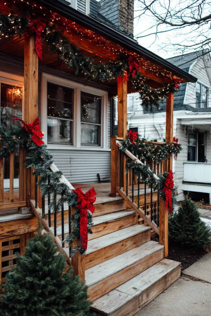 This cozy wooden porch captures the magic of traditional Christmas decorating. Lush green garlands wrap beautifully around the railings and beams, each one tied with a bright red velvet bow that adds the perfect festive contrast. Warm string lights weave through the greenery, giving off a gentle glow that makes the whole space feel welcoming and full of cheer. The natural wood tones of the porch blend perfectly with the greenery, creating that timeless, homey holiday charm.