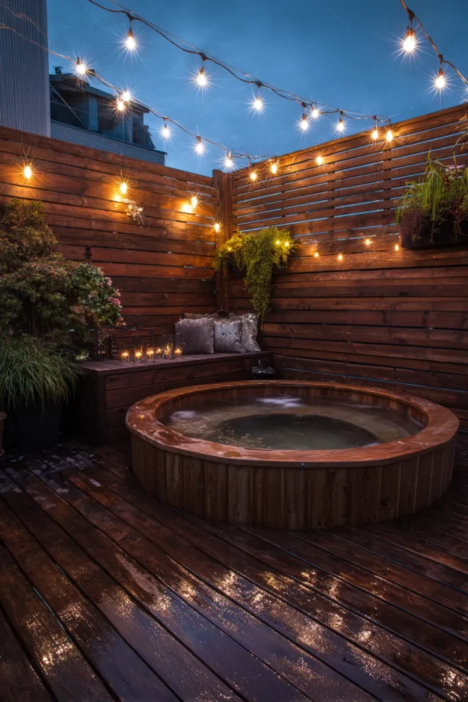 This cozy deck is tucked into a corner and framed by wood privacy screens. A round hot tub sits at the center with string lights overhead and greenery spilling from planters. Candlelight and soft reflections on the wood add to the evening mood.