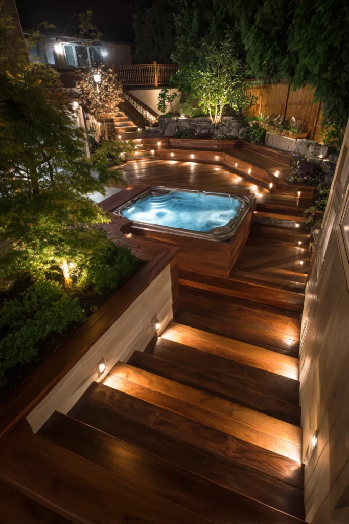 This deck is designed on multiple levels, with wide wooden steps leading down to a built in hot tub that sits neatly at the center of the layout. Warm recessed lights line every step and edge, highlighting the rich wood tones and guiding the eye through the space. Lush greenery, stone borders, and raised planters soften the structure and create a calm garden feel that feels especially cozy at night.