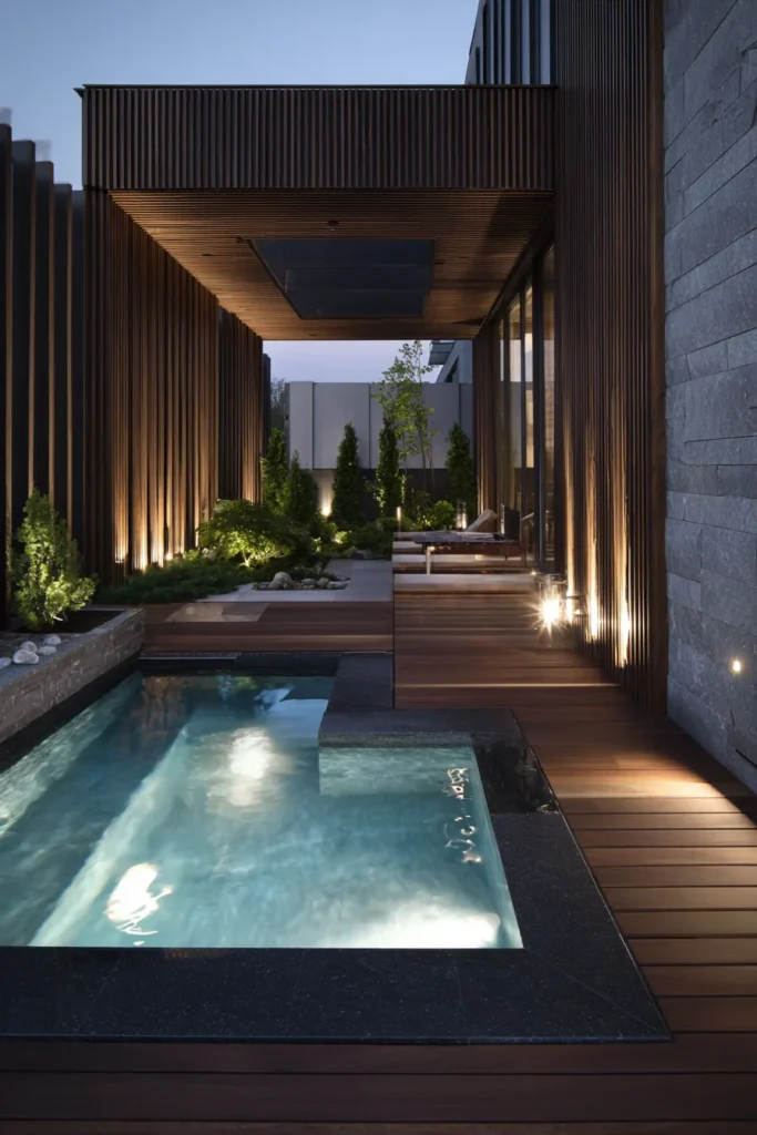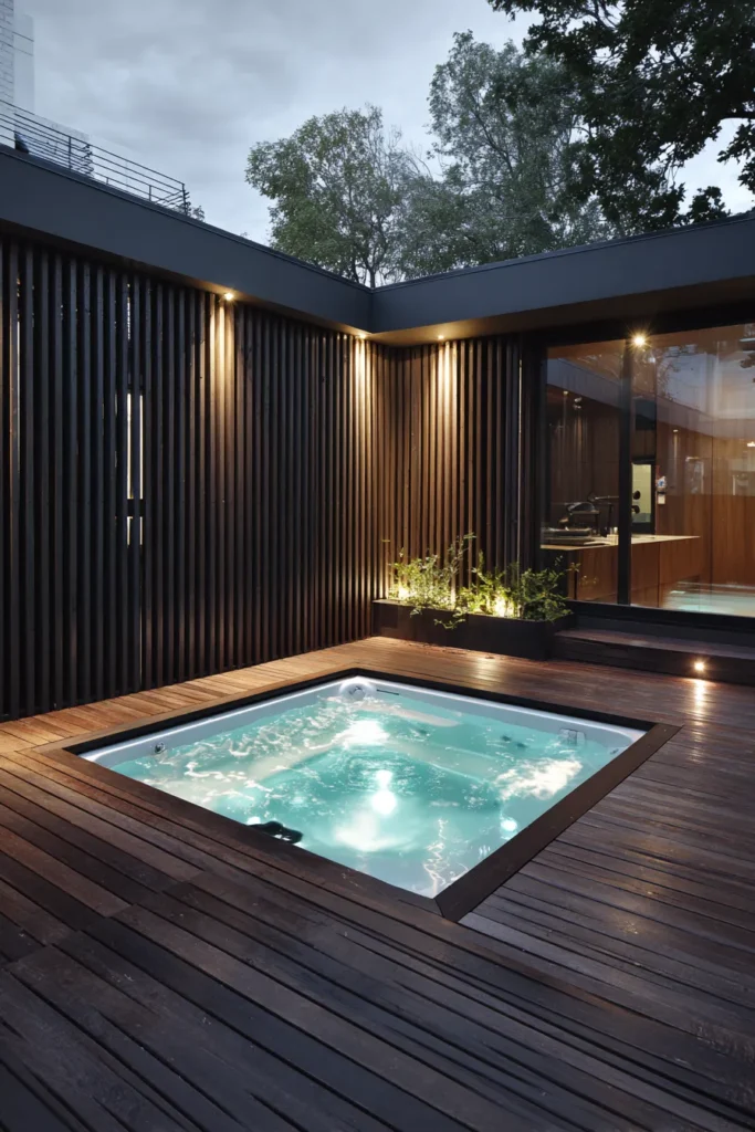 This courtyard style deck uses dark stained wood planks paired with a square hot tub set flush into the floor. Vertical slatted walls create privacy while letting light filter through in a soft way. Low lighting highlights the hot tub water and the surrounding wood textures. The overall look feels modern and very intentional.