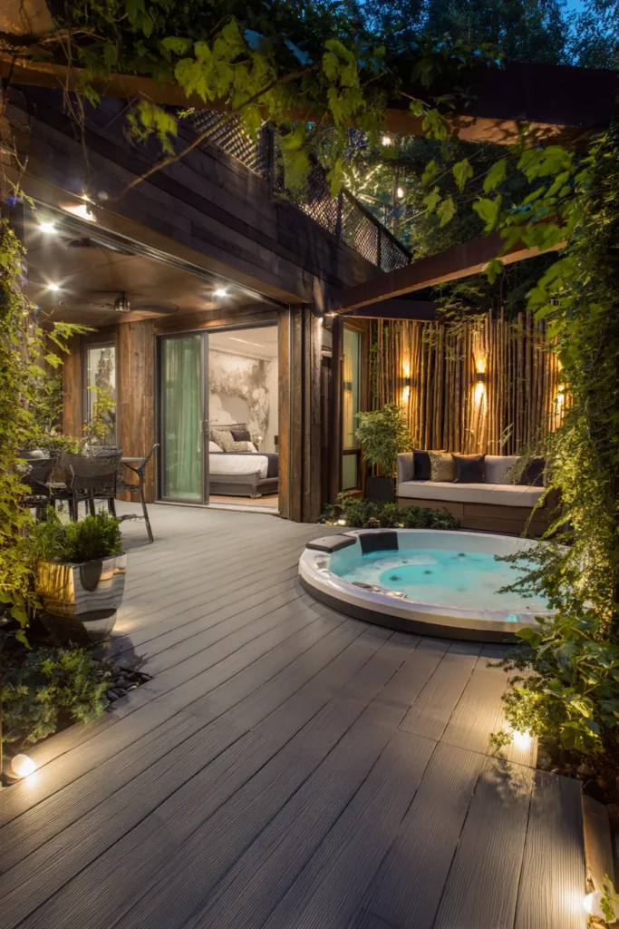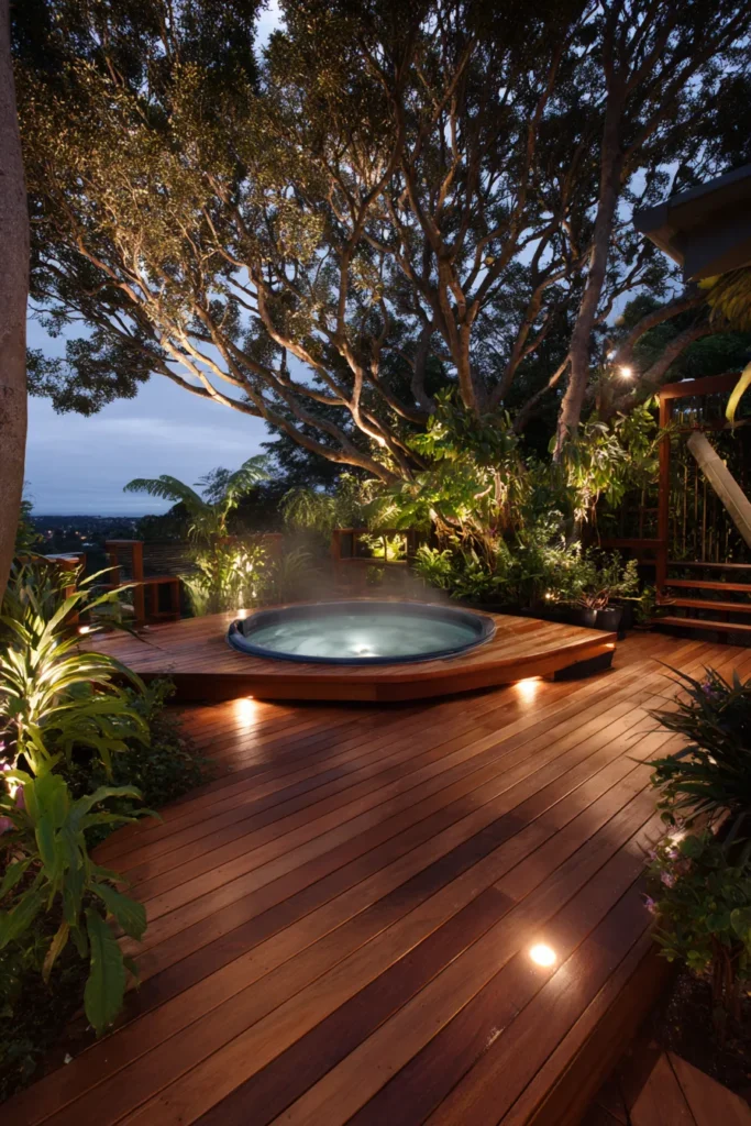This deck wraps around a round hot tub nestled among dense greenery and natural textures. Bamboo style privacy screens, soft lighting, and layered plants create a tucked away feel. The hot tub sits slightly recessed into the deck, making it feel like part of the landscape rather than a separate feature.