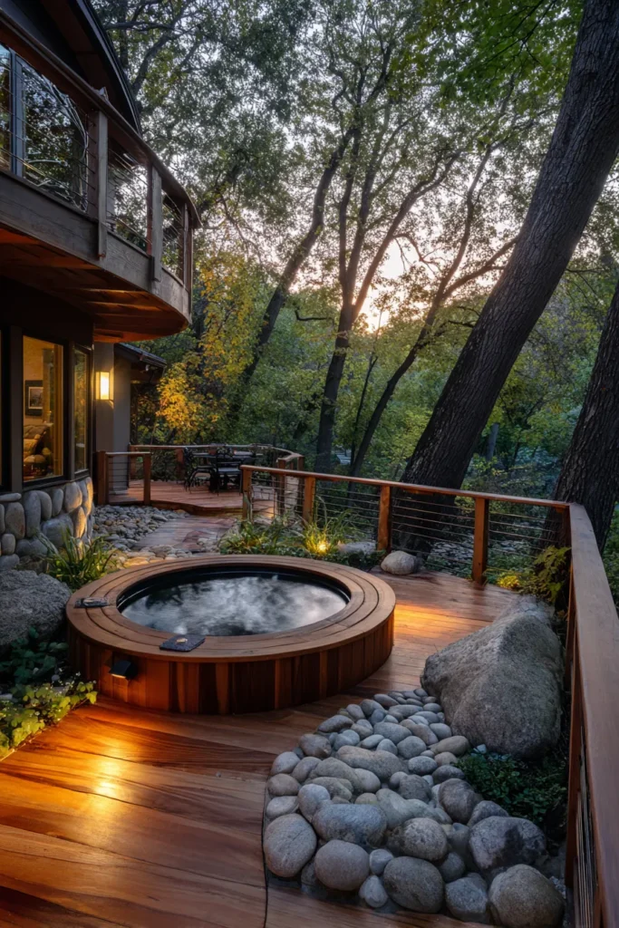 This deck curves gently around a round hot tub, blending seamlessly into the surrounding trees and natural stone details. Smooth river rocks line the edges, and subtle ground lighting highlights the wood grain and textures. The railing keeps the view open to the forest while still feeling secure and intimate.