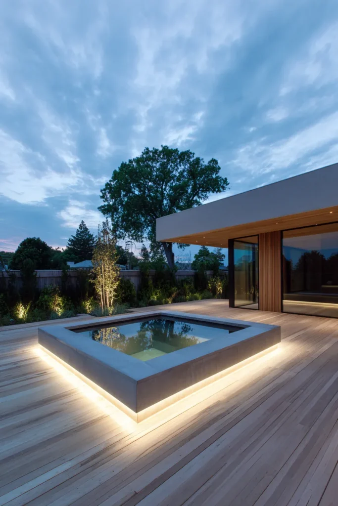 This modern deck features a square hot tub with a clean concrete surround that appears to glow from beneath. Light wood planks stretch across the open space, and the home’s large glass doors reflect the evening sky. Low landscape lighting keeps the focus on simplicity and balance.