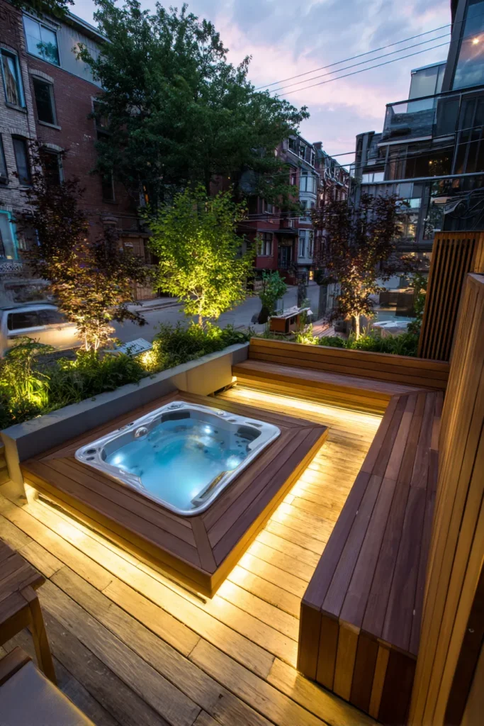 This compact deck makes smart use of space with a built in hot tub surrounded by wood benches and warm lighting. Planters and small trees soften the urban surroundings, while the lighting creates a cozy pocket of calm within the city. Everything feels intentional and well planned.