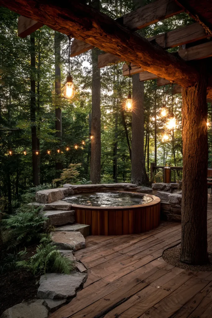 This deck is set deep among trees and features a round hot tub surrounded by natural stone and warm wood planks. A rustic pergola overhead supports hanging lights that glow softly through the forest. The textures feel raw and cozy, blending perfectly with the natural surroundings.