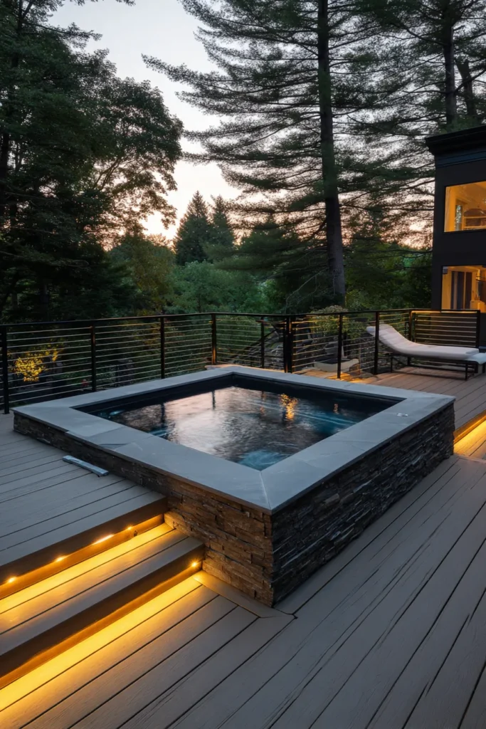 This design shows a sleek deck set among tall trees with a square hot tub wrapped in stone and composite decking. The railings are slim and dark which keeps the view open to the surrounding forest. Soft step lighting outlines the deck levels and adds a warm glow as the sun goes down. Everything feels balanced and calm with a focus on structure and nature working together.