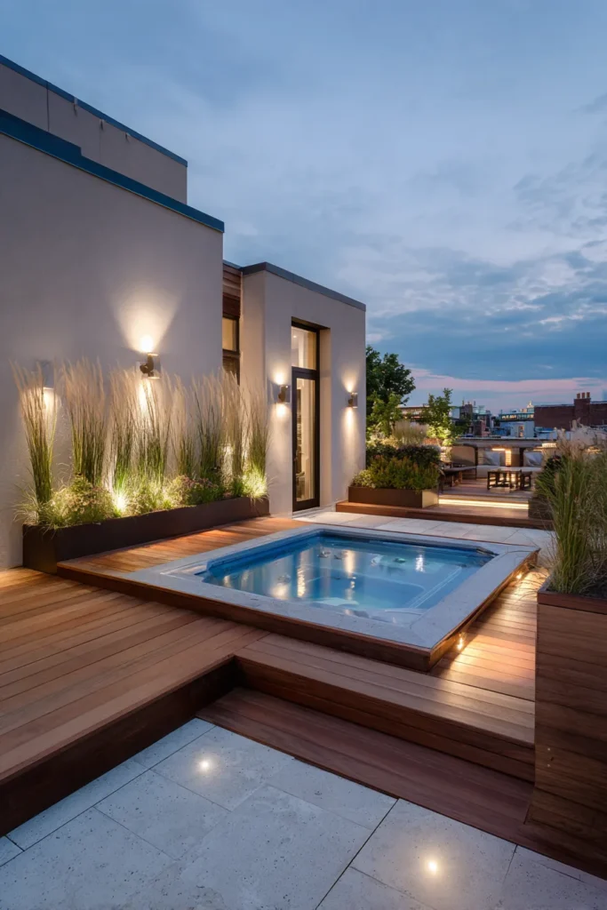 This rooftop deck includes a compact hot tub framed by warm wood decking and smooth stone borders. Built in planters filled with tall grasses line the walls and are softly lit from below. Wall mounted lights add a cozy glow without overpowering the space. The city skyline sits quietly in the background under a calm evening sky.