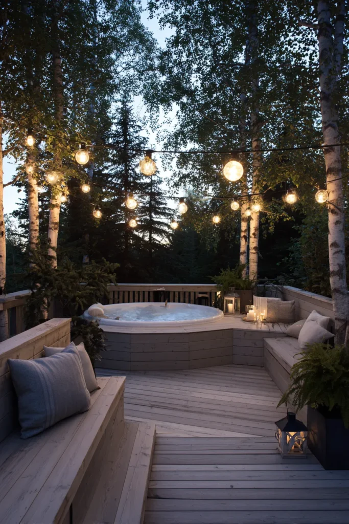 This deck sits surrounded by trees with a round hot tub placed at the center. Built in bench seating hugs the edges and is layered with soft neutral cushions. Overhead string lights are woven between trees, creating a gentle canopy of light. Lanterns and greenery finish off the cozy woodland look.