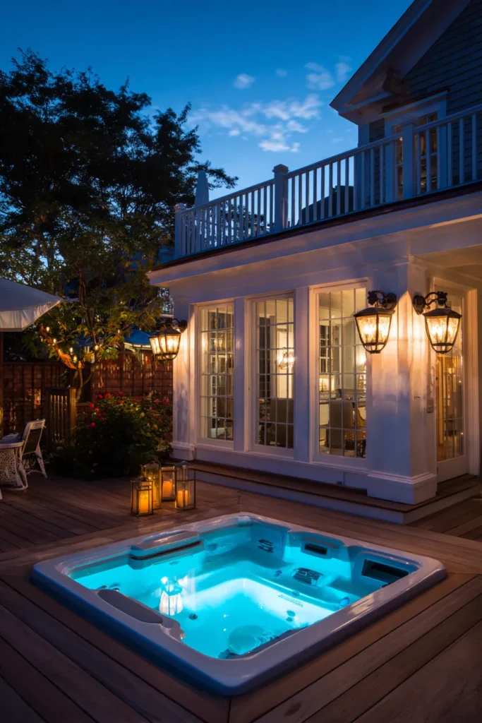 This deck pairs a traditional home exterior with a built in hot tub on warm wood flooring. Lantern style wall lights and soft deck lighting create a welcoming glow as evening sets in. The design feels familiar and comforting with just enough detail to feel special.
