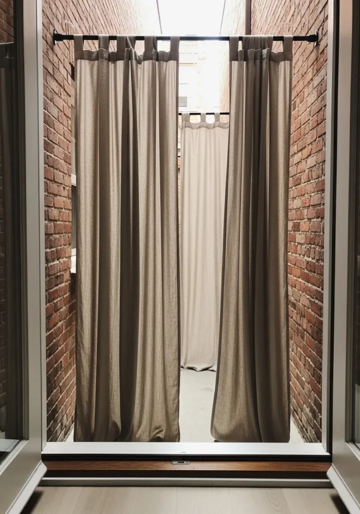 This narrow outdoor entryway features tall neutral drapes hanging between two brick walls. The curtains fall straight down and create a soft barrier that shields the space from view. Mounted high above the doorway, the panels give the passage height and elegance. The warm brick tones paired with the light fabric create a balanced and welcoming entrance.