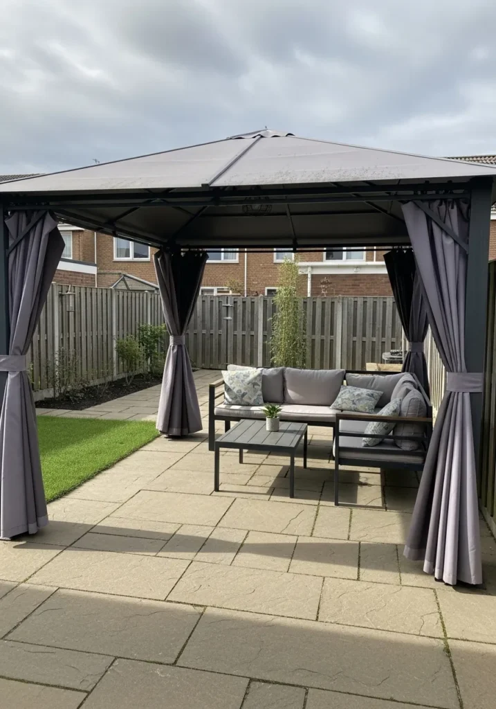 This backyard gazebo features structured deep gray curtains hanging from each corner post, creating a cozy enclosure around the seating area. The fabric panels are tied back neatly, revealing cushioned outdoor sofas and a low coffee table placed on a paved patio. The darker tone of the drapes contrasts beautifully with the light stone pavers and surrounding green lawn. The roofline feels solid and protective, while the curtains soften the edges and add that extra layer of comfort.