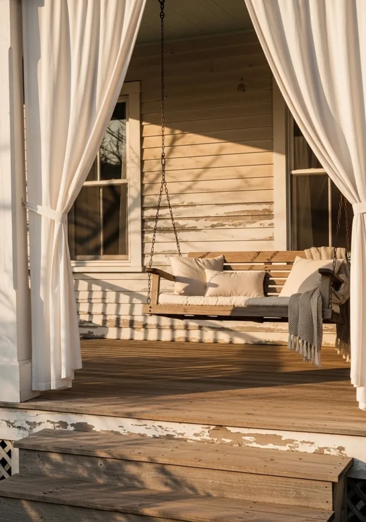 There is something about this design that feels incredibly inviting. The curtains make the porch feel like a retreat rather than just a walkway. I love how they add softness and drama at the same time. It feels romantic but still practical, and that combination always wins me over.