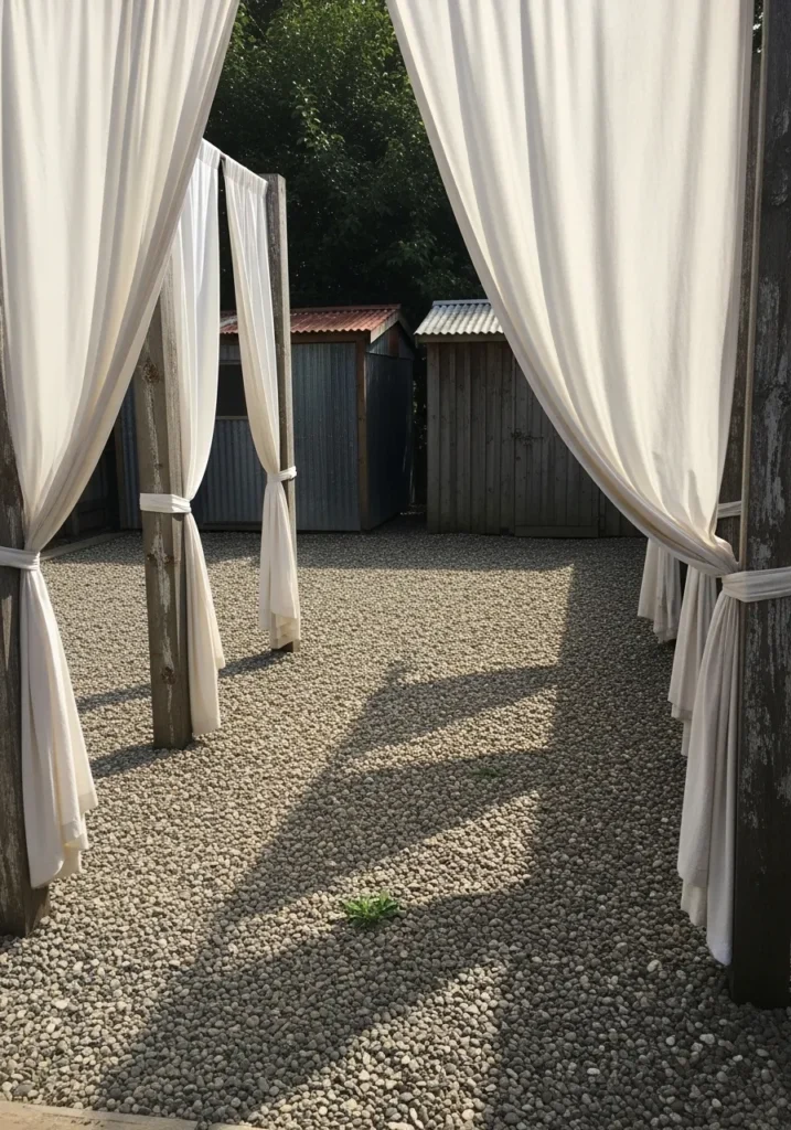 This outdoor courtyard features tall white drapes suspended between wooden posts along a gravel path. The curtains create a private walkway effect, gently swaying and casting soft shadows on the ground. The simple gravel base and wooden fence keep the look natural and understated. The light fabric brightens the entire space and adds movement.