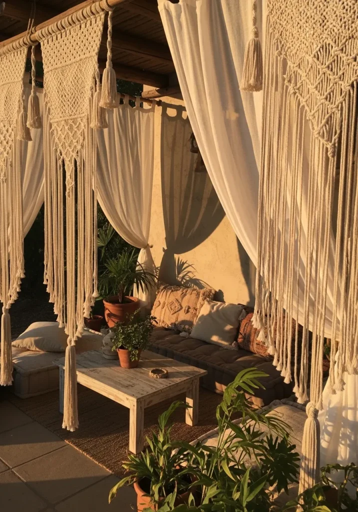 This cozy outdoor lounge is wrapped in layered cream curtains and delicate macramé style panels that hang from a wooden frame. The fabric drapes loosely around the seating area, creating a soft cocoon effect. Warm light enhances the texture of the textiles and highlights the earthy tones of the decor. Potted plants and natural materials complete the relaxed vibe.