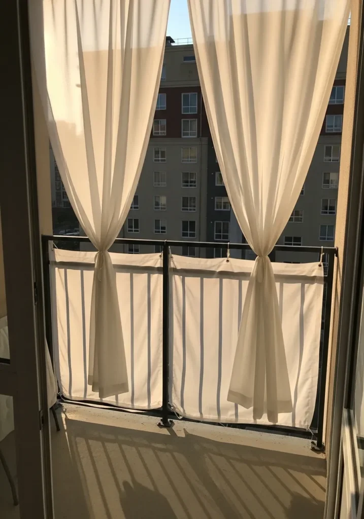 This balcony setup uses sheer cream curtains to create privacy while still allowing sunlight to filter through. The fabric is light and airy, gently diffusing the city view behind it. Mounted along the railing and window frame, the curtains soften the hard lines of metal and glass. The neutral tone keeps everything bright and cohesive, even in a compact outdoor space.